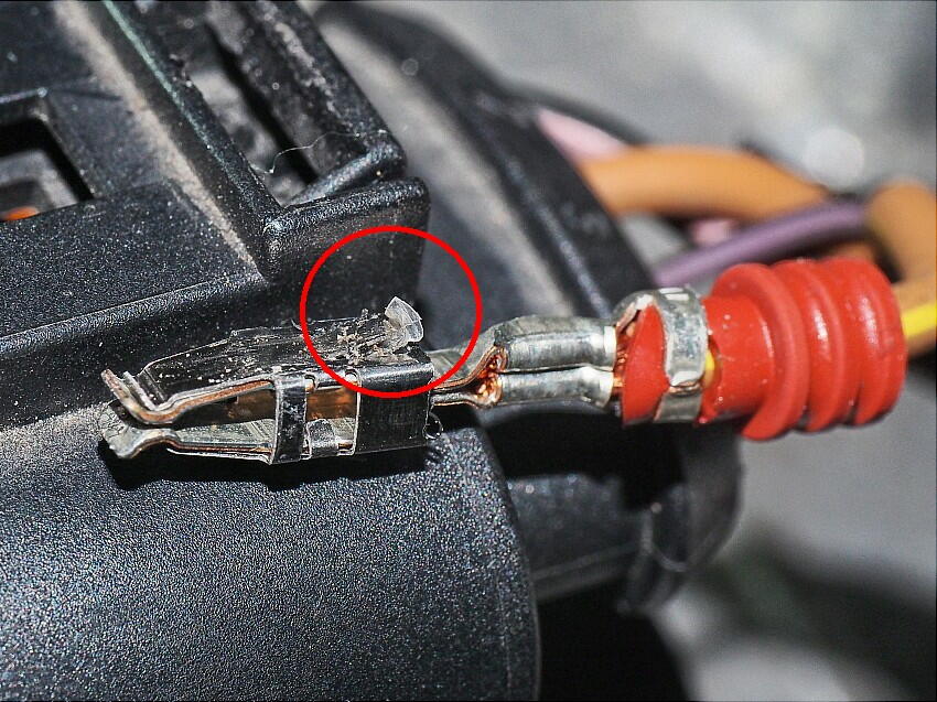 | コイルの二次側のGNDがPoorな状態だったので、改善する。 火花の飛び方は今よりは強力になる筈。エンジンの始動は良くなるだろうし、高回転時の失火対策になる。 まずは、コネクタピンを抜く。カプラーを覗くと紫色のロック板があるので、これをズラして抜いて置く。