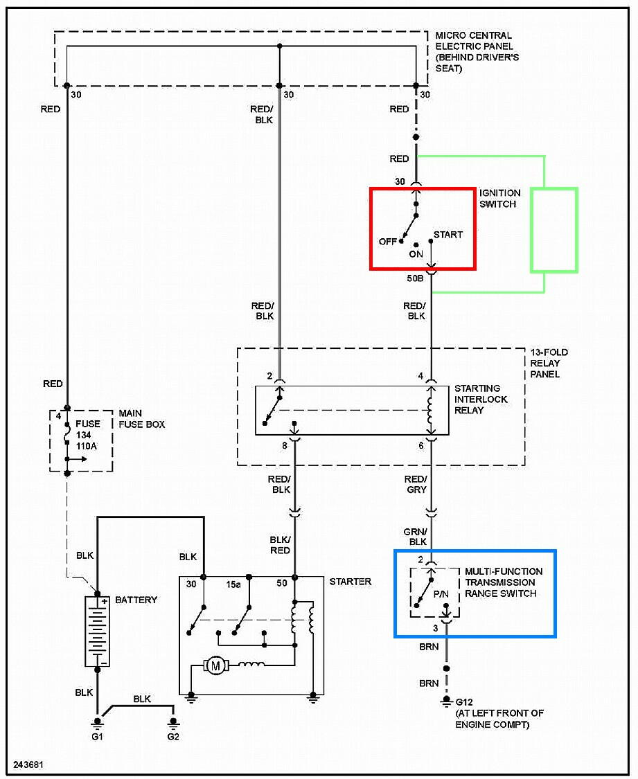 回路図を見ると、青枠で囲った所にトランスミッション系のスイッチが有り、ギアレバーが、パーキングかニュートラル 位置にないと、キーを捻ってもエンジンは掛からない安全設計となっている。 赤枠が、イグニッション スイッチで、キーをstart位置まで捻ると、その下の破線枠内の、ステアリング インターロック リレーのコイルに電流が流れ、スタータモーターに電流が流れる仕組みとなっている。 なので、緑枠内にキーをACCの位置( 下回路図では、赤枠内のon )まで捻られた事を認識する仕組みと スタートボタンを入れ込めば良い。