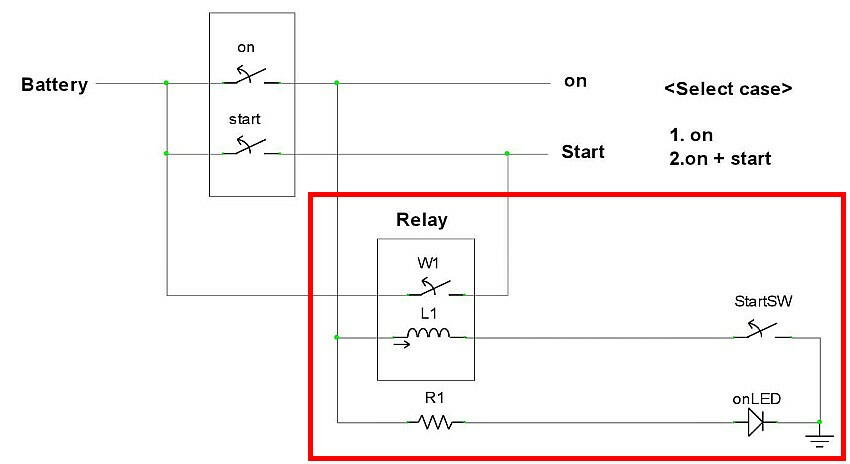 仕様 : onまでキーを捻ると、onLEDが点灯。startSWを押下すると、スタータモーターが起動