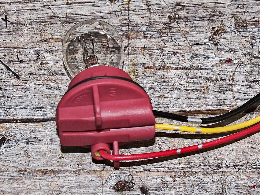 下画像の電極に、繋がる配線色を示した。 電球の側面はGNDなのだが、そこに位置する 電極に繋がっている配線は、赤色。 さらに、ブレーキで灯る電極には、黒色。 と、真逆の配線色となっている。 ( 尾灯が灯る電極には、黄色 )