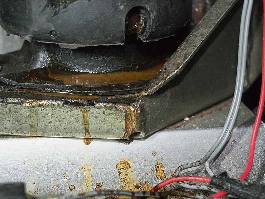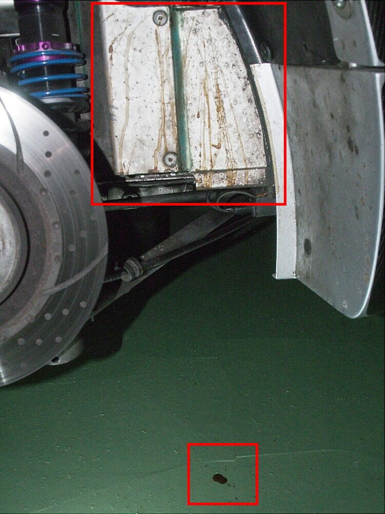 | 後輪左下に、オイルっぽい溜まりが有った。 後輪、ホイールアーチを外すと、漏れの箇所が判明。 エンジン マウントからオイルが流れ出ていた。