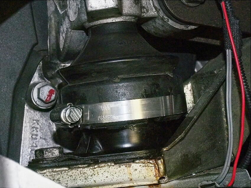 部品が来るまでの対処。ゴム部に亀裂は入っていない状態なので、ホースバンドで締め上げて補強。 これで、旅行には行けるかな。