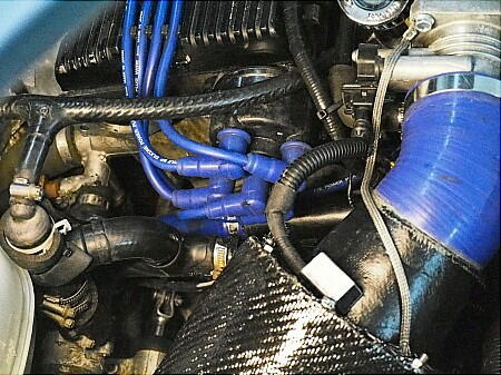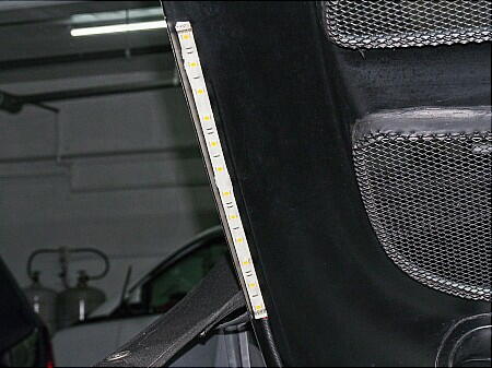 さて、LEDの設置場所だが、熱を避ける、手元を明るく照らす場所を探した。 エンジンカバーの中央にLEDテープを置いて見ると、エンジン上部は明るいが、下側には光が回らない。 しかも、熱をモロに受ける事から駄目。 色々試して見て、一番良い所が下の場所。 熱の影響は無し、エンジン側面から照らすので、下側にも 光が回る。