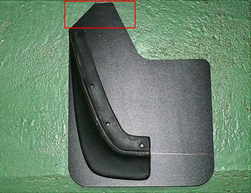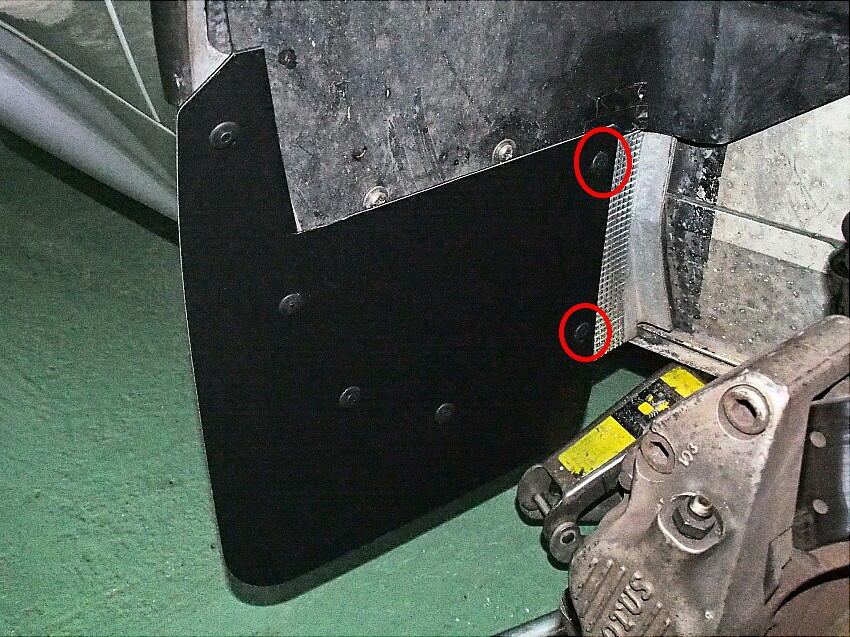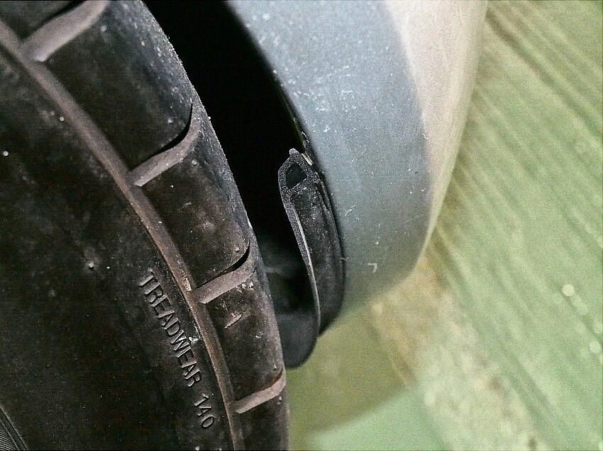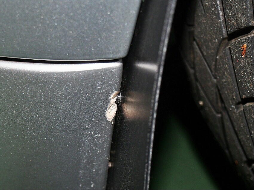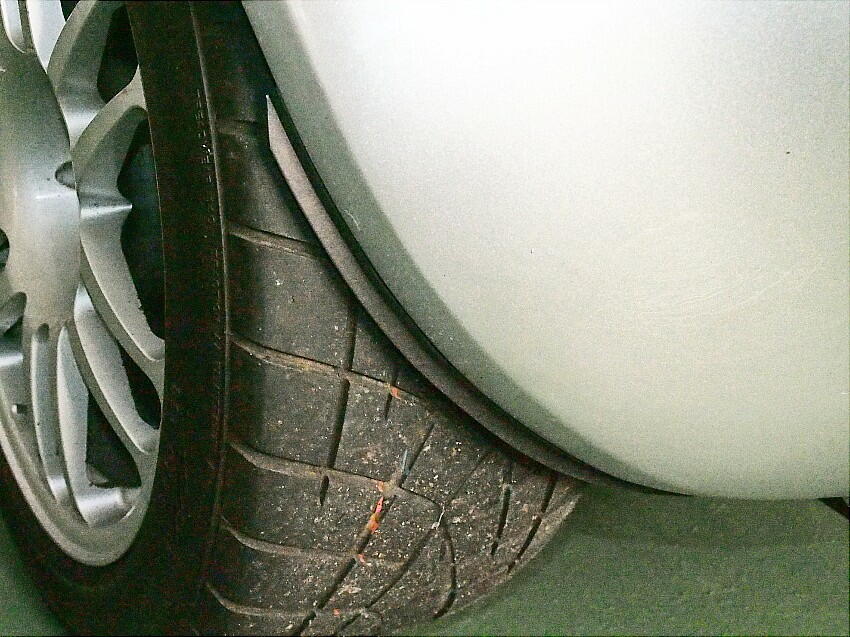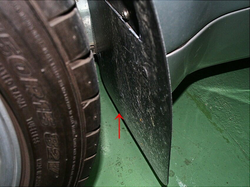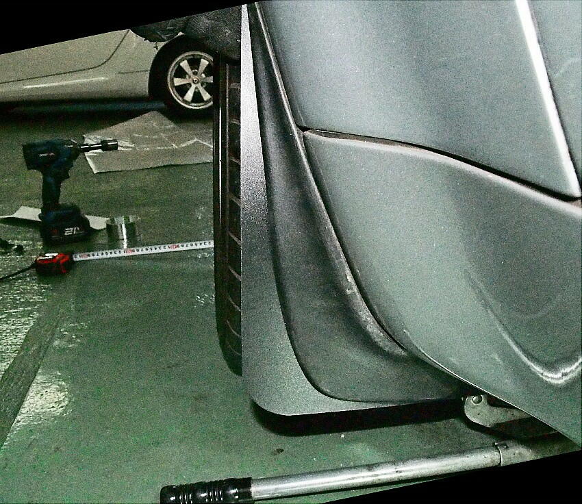 | 小石巻き込みに対する音防止に効くかも ? の淡い期待と、経年劣化で状態が酷いので交換する事にした。 オリジナルのマッドガードは、デザイン性重視なのか、タイヤの幅をカバー出来ていない。 下写真は、ステアリングを左に90度切った時の、タイヤ内側の延長位置を示している。この位置にマッドガードは無い。