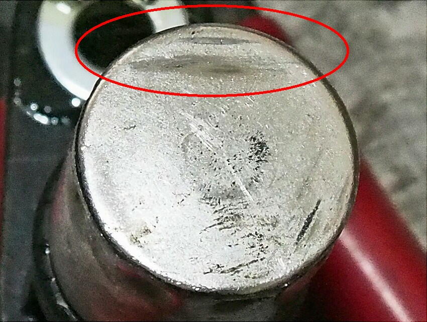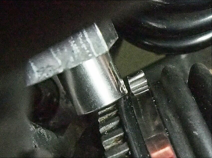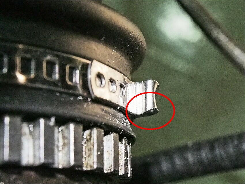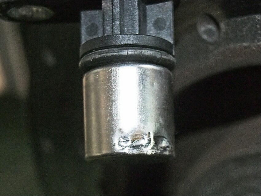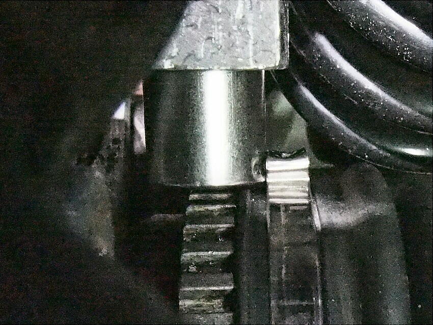 ジャッキアップして、後輪を手回しすると ...... こりゃ、車輪速センサーが何かに当たっていると直感。 タイヤを外して、覗き込むと ..... 嬉しくないが ビンゴ ! 何と、ドラシャブーツバンドのカシメ部と車輪速センサーの筒部が当たっていた。現在使用のセンサーは、エリパで購入した物。 CMOSセンサー仕様のくせに感度が低く、ハブに有る凹凸部から余り離せないのだ。それでも、過去にメーター内の 回路変更をして、使える様にしているのだが。