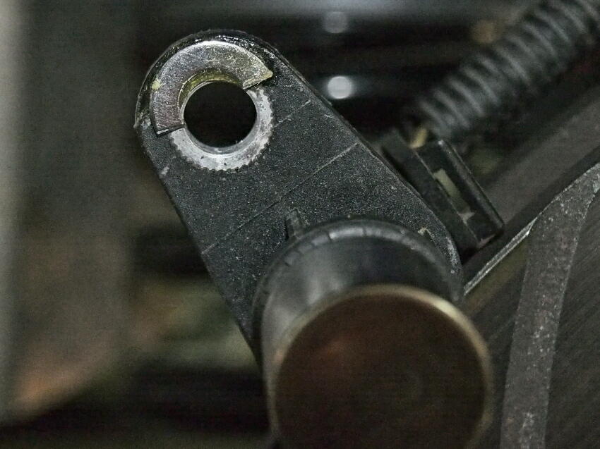 対策をする。車輪速センサーの取り付け方に手を入れる。固定ボルトの台座にカットしたワッシャーを貼り付ける。 これで、多少外側に傾いた状態になる。