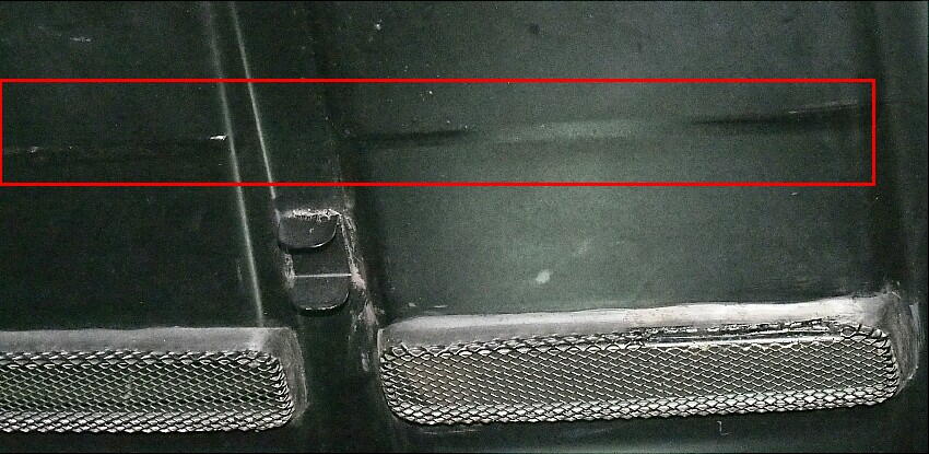 この状態で、当たるかどうかを確かめる為、光明丹を塗ってエンジンフードを締める。再度開けて見ると、当たってはいなかった。 モールが厚いのか。