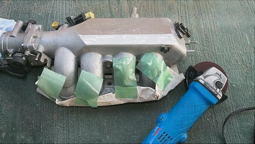 後は、インマニとの干渉を無くすだけ。 削る部分をケガいた後、インマニを取り外しサンダーで削る。