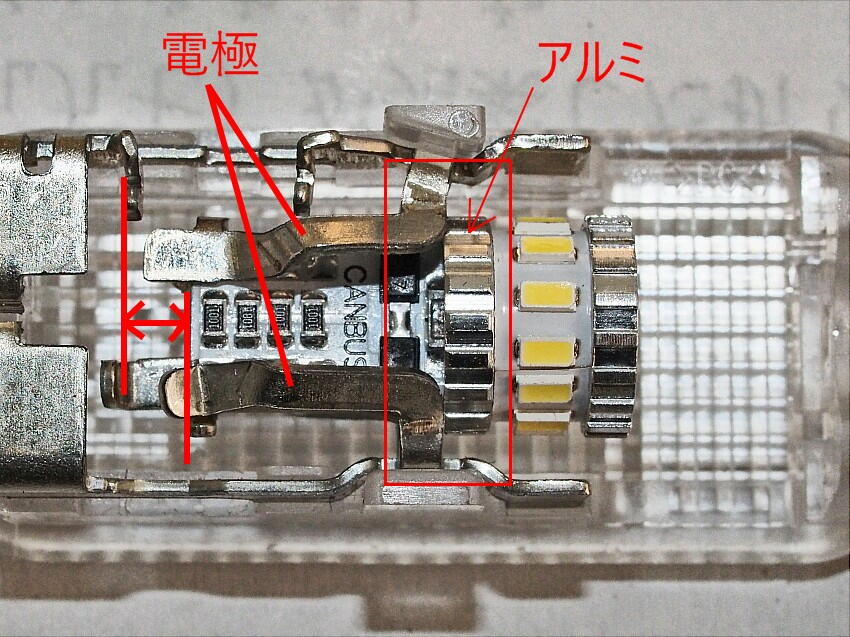 一方LEDの先端部は放熱板で覆われている。 この放熱板は アルミなので、電極(+ ー)に接触してしまい 怒 ショート状態となる。LEDの電極部が長ければ使えるのだが、ここだけはT10型の長さとなっている。
