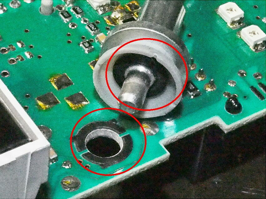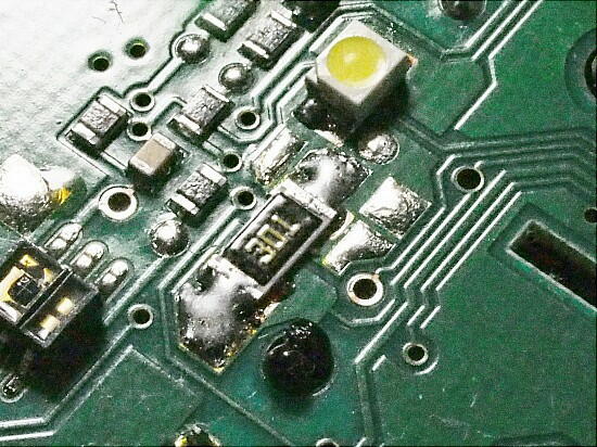 しかし、抵抗の一端からLEDに繋がるまでの抵抗を計ると、抵抗値が揺れていた。 これは、半田不良だ。