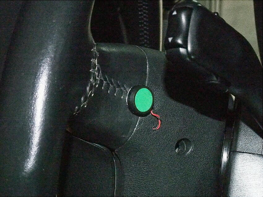 ステアリングの一部にΦ1.5mmの穴を開けて、配線を通し、スイッチに半田付け。両面テープで固定して完了。