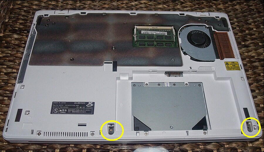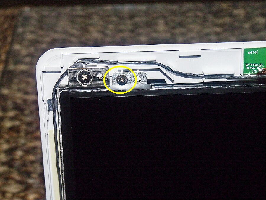 2か所のネジを取り外し、ヒンジ部のプラスチック部品を取り去る。