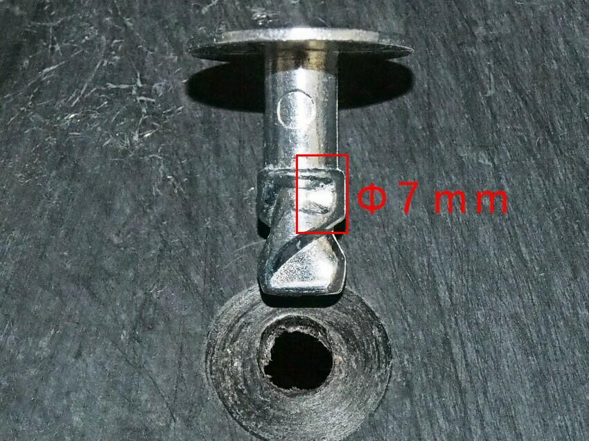 固定が解けた理由は、クリップの板厚が薄く剛性が低い為。下写真は、完全に固定された状態なのだが、上写真と 見比べてみると .... 完全固定の方は、ピンのラッチ部と( 一個下写真の赤四角で囲んだ所 )クリップの 爪が噛み合っている。 ところが、上の写真では、クリップの爪がピン溝の途中で止まってしまっている。