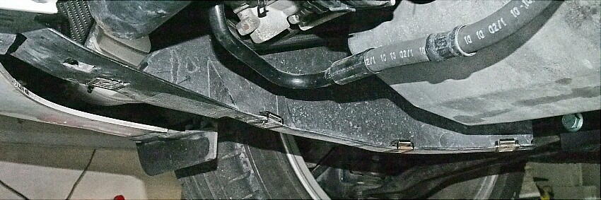 新たに購入する事になるが、このファスナー寸法で合うか否かを、実車で試してみる。 アンダーパネル上に、白丸で示した所がネジ止めされている箇所なのだが、赤四角で示すボディ側は鉄板なので クリップを装着出来ない。ここは、従来のネジ止めとする。 他の白丸の所は、クイックファスナーに置換する。