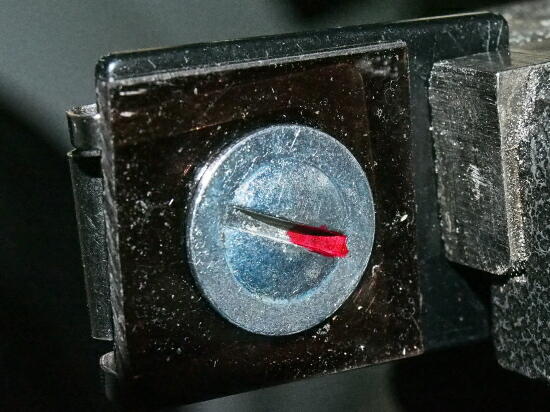 上の写真は、ピンに赤くマーカーして、リリース状態から普通にピンを回して、これ以上回らないまでの角度(半固定)と 完全固定までの角度を示した。半固定までの角度は、180度未満。良く見ると、クリップが歪んで傾いているのが 解る。 一方、完全固定までの角度は、余裕で180度を超えている。