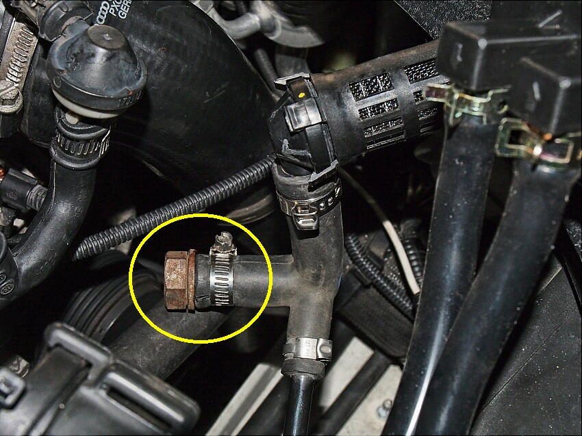 キャニスターは、底部のナット1個を外して、上に引き上げれば外れるが、大気吸入口と繋がっているテフロン管を フリーな状態にする必要が有る。その為に、クーラントリザーバタンク下のクリップからテフロン管を外して置く事。( 下の黄〇 テフロン管を折らない様に注意しながら、大気吸入口のクリップを外す( 上の黄〇