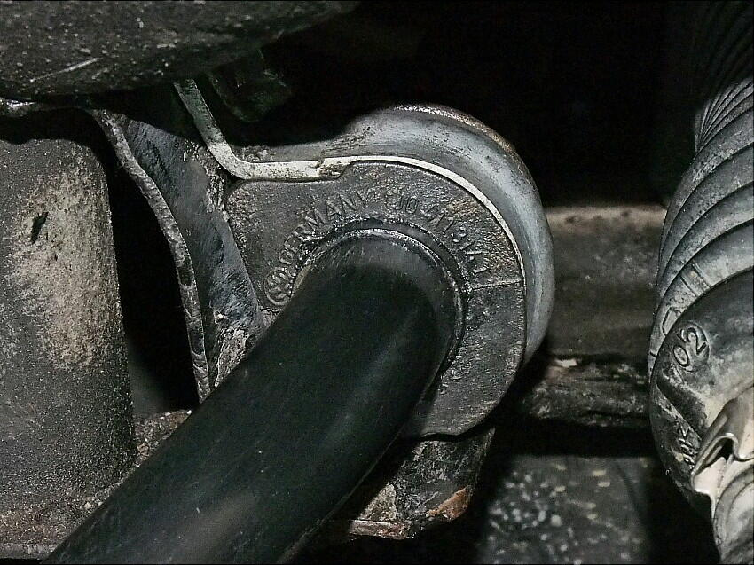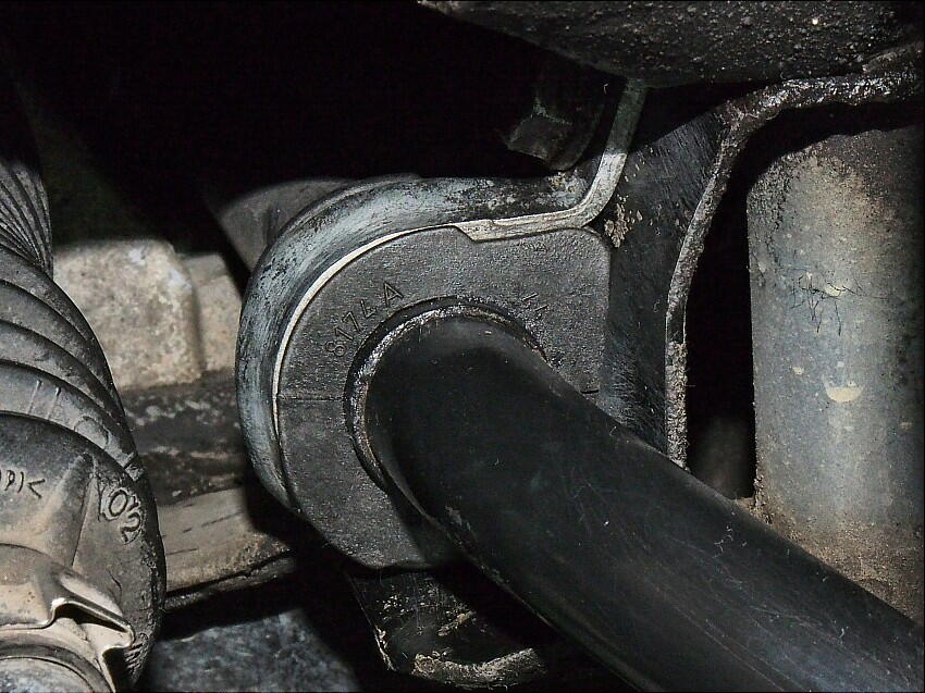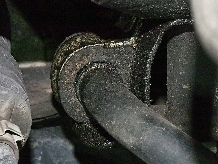 これで、スタビはフリーな状態になった。スタビを固定しているボルトを外す。フリーとなったスタビを押したり 揺らしたりしながら、ブッシュを固定しているブラケットを取り外し、ブッシュも捻り出す。見てもらうと解ると思うが グリースが塗られていたのは、外側のみ。 ブッシュの内側(スタビに当たる面)には、一切塗られていなかった。
