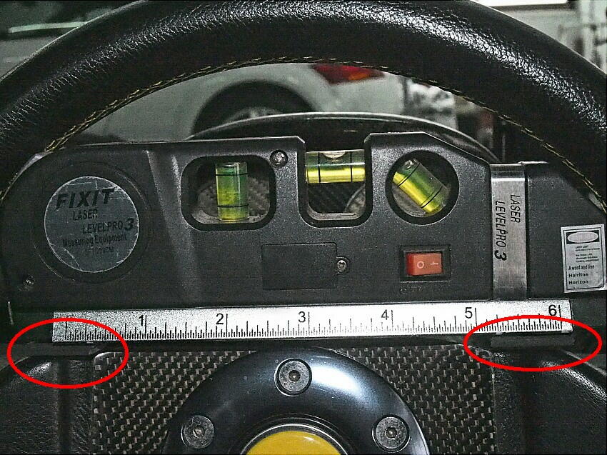 全てやり直して、規定値通りにした。ステアリングのセンターは、無い知恵絞って、水平器を付けて行った。 水平器をただ置くだけでは安定しないので、ゴム板を両側に貼り付けて固定した。