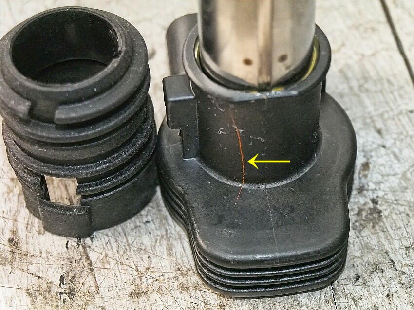 そこで、分解を始めると、クラックを発見。( 解り易いように、光明丹で色付けしている 場所からすると、二次コイル側の断線の可能性が大。