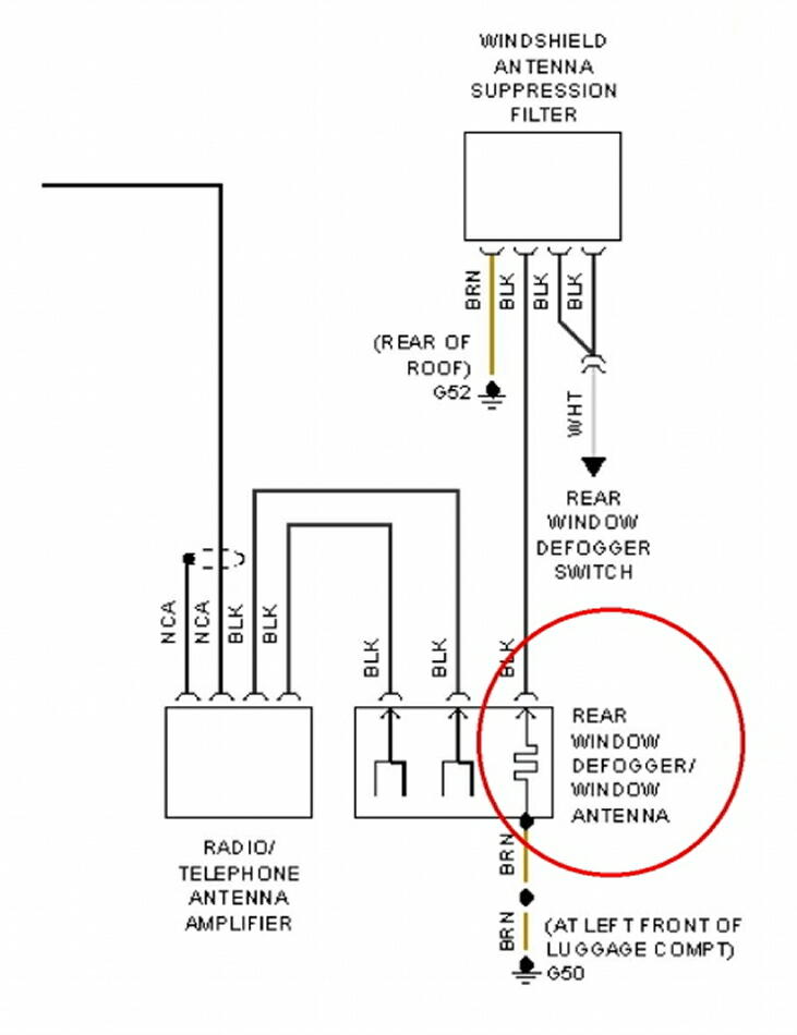 | アンテナ周りの回路が下。 やはり、リアデフォッガーとアンテナが共有していた。サプレッションフィルターが 付いているが、これって本当に効いているのか ?