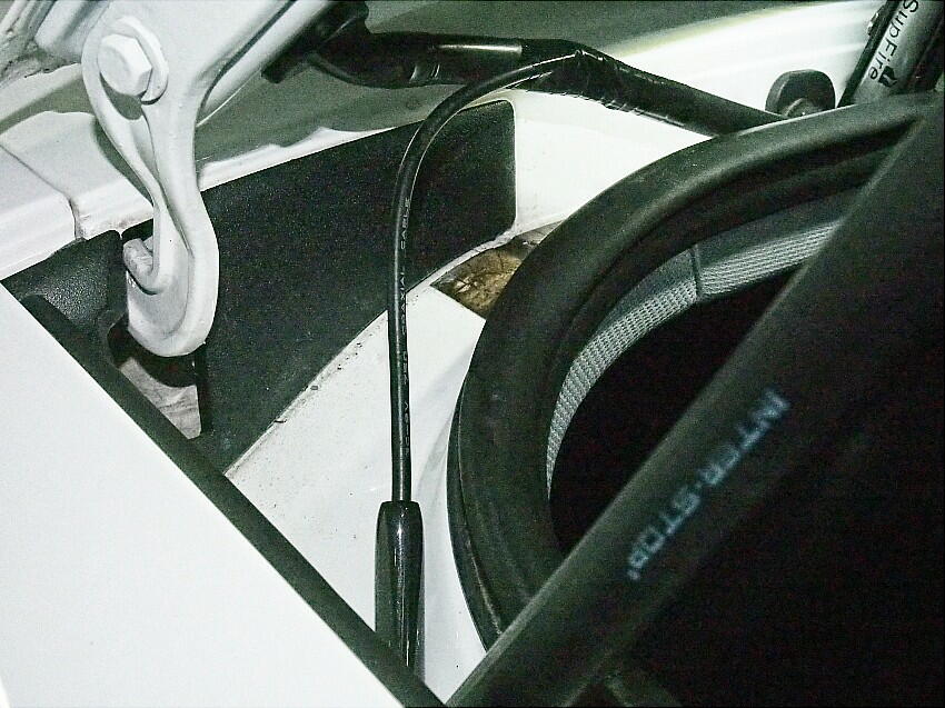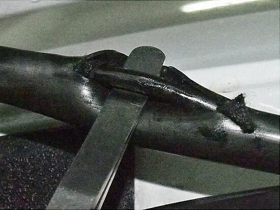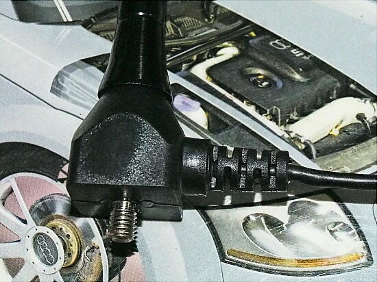 さて問題は、ダイポールアンテナを、どの様に入れるかだ。 現行のアンテナ線をカットして繋ぐか、パラに繋ぐか。 作業的には、前者が楽。デメリットは、現行のアンテナは使用不可となる。 面倒だが、後者で行く。 保護チューブを切開し、同軸ケーブルを引き出す。 そして、同軸ケーブルを切開して、GNDと信号線を出す。
