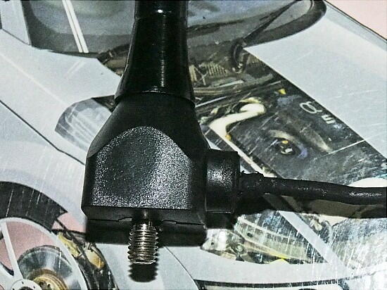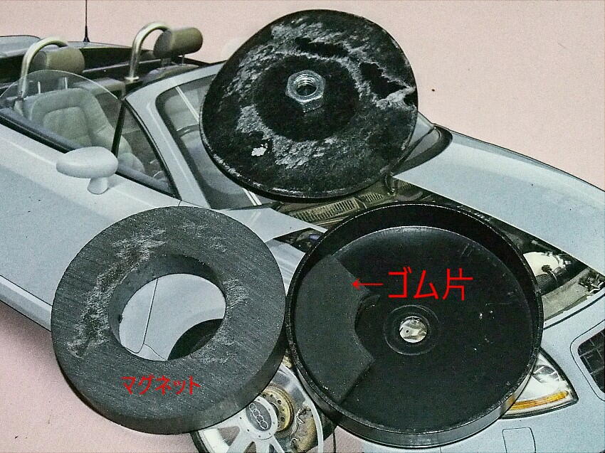 次は、機構面の作業。 アンテナの基台は、マグネットが組み込まれているので、自由に取付場所を選べる。ロードスターと同じ場所が 見栄えが良いので、載せてみると傾く。 垂直にするには、基台の片側に5mm程嵩上げする必要が有る。