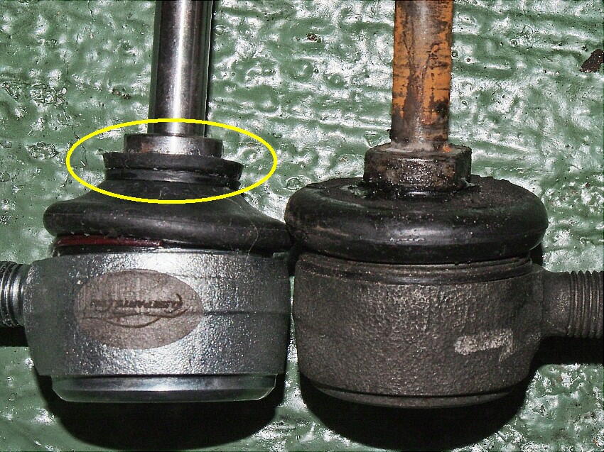 ドラシャを組み入れる前に気が付いて良かった。組み入れた後ではナットを外せない。ナットもラチェット延長ソケットを 使わないと外すのに厄介な場所。外したインナーボールジョイントを見ると、正常な物と比べてブーツが破損していた。