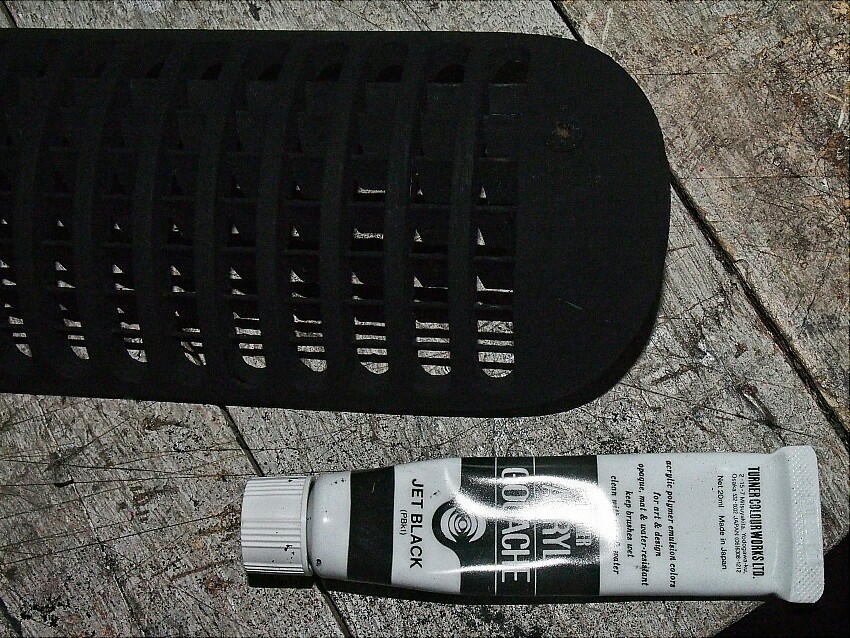 そして、無反射塗料を刷毛に付けて塗る。前回塗装しているが、塗装が薄かった為、若干反射が見られたので 今回は重ね塗りをした。 結果、真っ黒で反射無し。 フラッシュ撮影して塗料チューブは光っているが、ベント トリムは光っていない事でも、効果の程は解るだろう。
