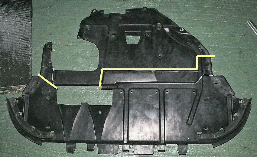 そこで、アンダーパネルを加工する事にした。 加工と言っても切断する。黄色線で示した所を切断する。 切断する事に因る剛性低下は避けたいので、固定位置を考えた上で決定した。