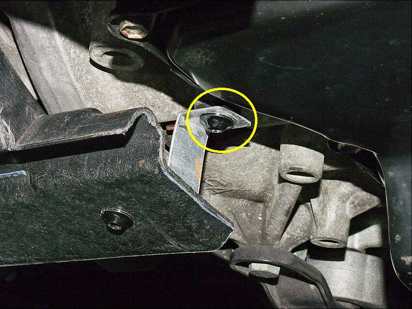 1箇所固定を追加した。 ここは、衝撃を受けた際に、留め具が直ぐに曲がるか、外れる構造にしている。 理由は、黄色丸の固定は、エンジンブロックの空き穴を利用している為。