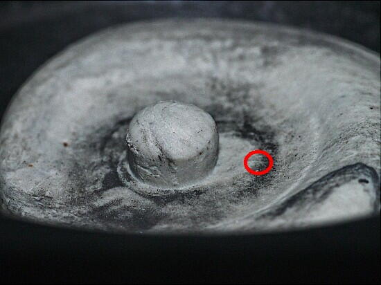 そして、トランクを閉めた後、再度開ける。下写真の様に、粘土が潰れた状態となった。 ストッパーの中心部は空洞なので、圧縮された粘土は、この空洞内に押し上げられる。 飛び出た粘土の高さは 左右で異なり、1mm程違う。 これが、上記の ストッパーの設置高 と一致する。