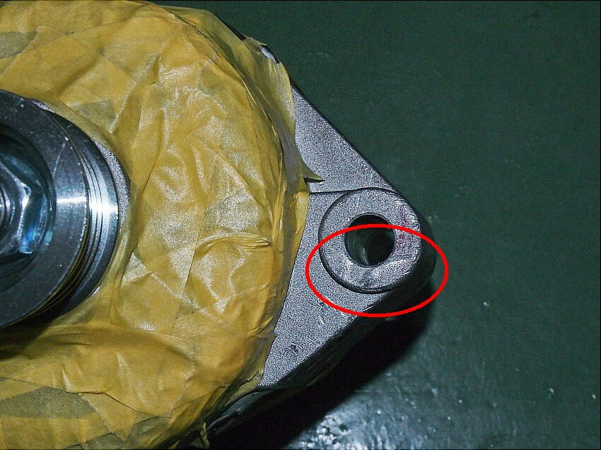 まずは、オルタネータを苦労しながら、ブラケットの位置まで移動させる。 上側にボルトを差し込み落ちない様にしてから、下側を 嵌め込むのだが ....... 入らない。 金テコを使って押し入れようとするが、微動だにしない。 苦労して取り外し ( 泣 下写真の赤丸を見ると、ブラケットの入口に多少入った痕跡が残っていた。 やはり、削って置くべきだった。 マスキングして、この突起部をサンダーで削る。