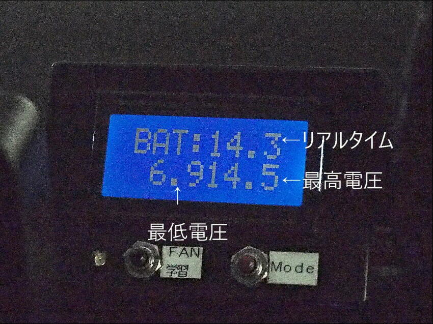 最低電圧=6.9Vは、 スタータ起動時の一瞬だが、ここまで下がる。 新品のバッテリーだと、7.5Vぐらいなので、バッテリーの劣化( 出力抵抗の増加 )が見られる。