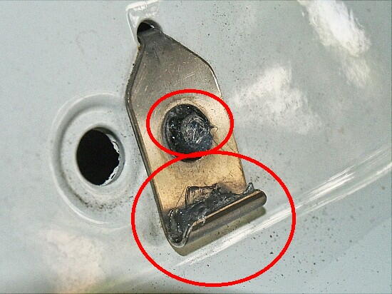 異音が出ている所は、3箇所有った。 一つ目は、下側の爪と止めているボルトで、プレート当たってビビり音が 出ていた。 ここは、シリコン剤を塗布。