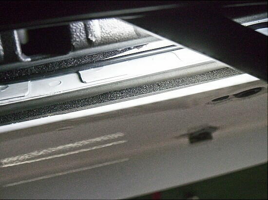 二つ目は、プレート裏とリアクラムシェルが当たっている。 ここも、ビビり音が出ていた。 ここは、プレート裏に2mm厚のスポンジテープを張り付けて置いた。