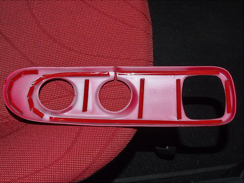 さて、貼り付ける事にする。 ここで、切り込みの意味が解った。 お気づきと思うが、シフトノブが大きいと 一旦ノブを外す必要が有る。切り込みが有る事で、シャフト部に切り込み部を当てた後 捻れば、シャフトの太さなら 通せる。 これは、楽だ。