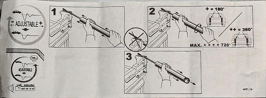 取説は、下の紙っぺら一枚。 初めて使う人は、これで理解出来るのだろうか? と、思ってしまう。 確か記憶では、調整できるのは伸び側だけで、縮み側は関係なし。この減衰調整機能は、使用中に へたり を 感じ始めた時に減衰力を強め方向に振って、乗り味を取り戻す機能。まあ、最初は360度回して中間に設定してみる。