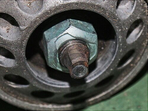 ナットを緩めようと先端部を見ると、何じゃこれ ? チマチマと、モンキーとディープレンチで外す。