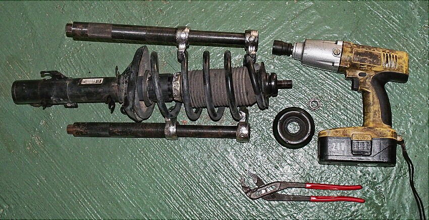 さて、分解する。 スプリングコンプレッサーを掛けて、シャフトを軽くコブラプライヤーで掴んだ後、インパクトで ナットを外す。