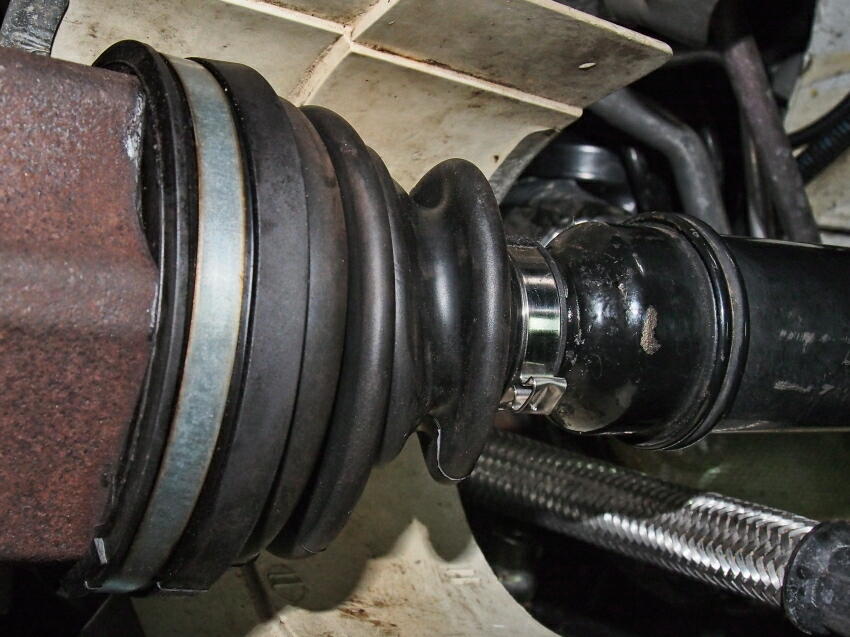 インナー側のドラシャを外さずに作業した事で、やはり弊害が生じてしまった。ブーツの変形が只事ではない状況に。 せめて、ブーツバンドを外して置くべきだったか ...... 90度ぐらい捩じれてしまった。