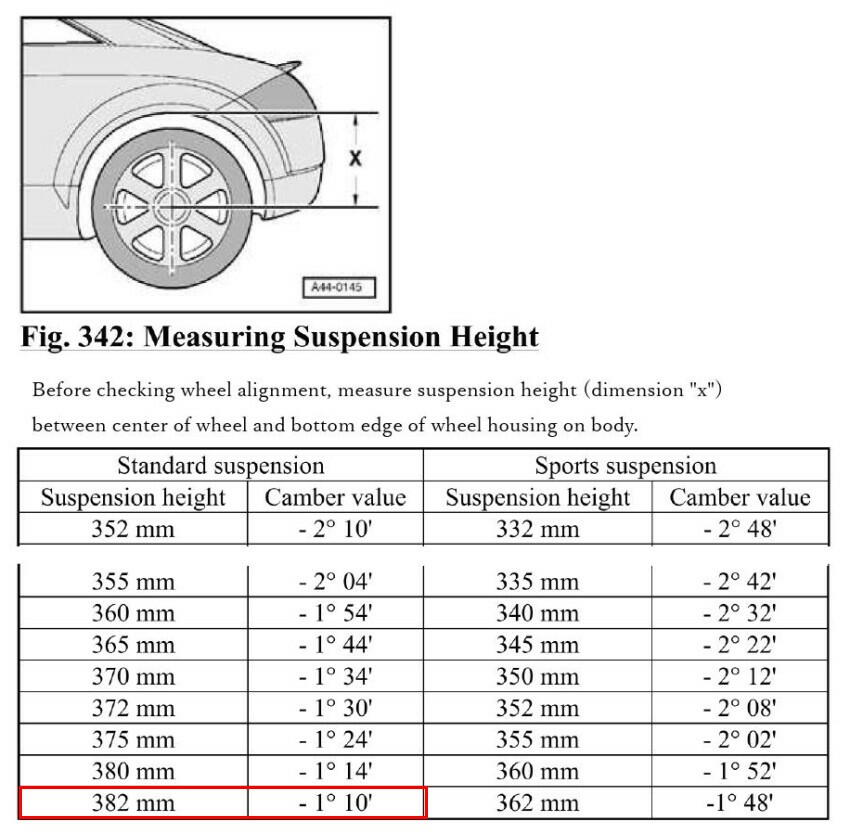 また、下記の説明も有った。確かに、車高によってキャンバーは変化する。現在の値は、390mmなので、表からは −1.1°未満となる。