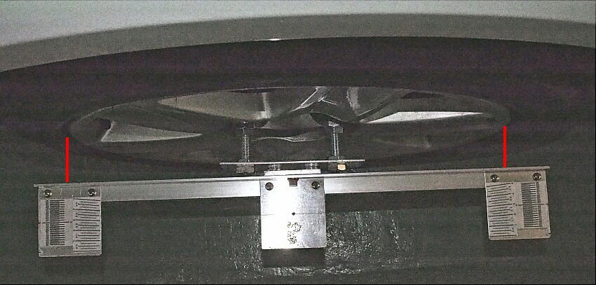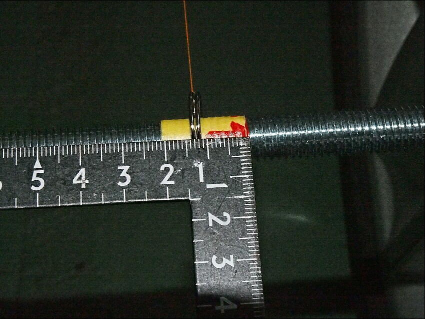 測定治具をセットする際、気を付けなければならないのは、ハブキャリア側のM14の雌ネジは、貫通している事。 上記の測定用ボルトにはストッパーが付いていないので、ねじ込むだけねじ込まれてしまい、基準点を失う。 そこで、ホールの前後で同じ寸法になる様に調整する。( 要は、ホイールに対して測定バーを平行にする )