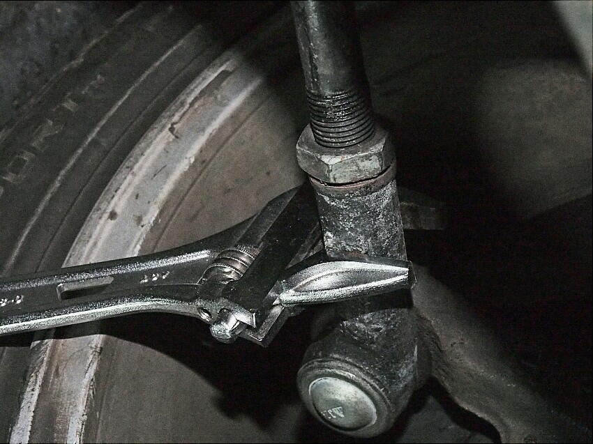 この狂いを修正する。ロックナット緩め、15mmのスパナでタイロッドを回して調整する。