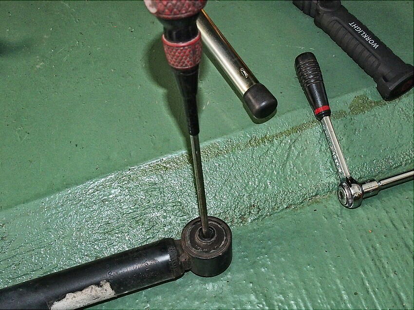 アッパーマウントボルトを外そうとラチェットを掛けて回すが、結構締まっているし、2本の内1本が、ホイール アーチライナーに掛かるので、ここはインパクトで外す。ナメル心配も無い。トレーリングアームの結合ボルト1本を 外せば、ダンパーは外れる。