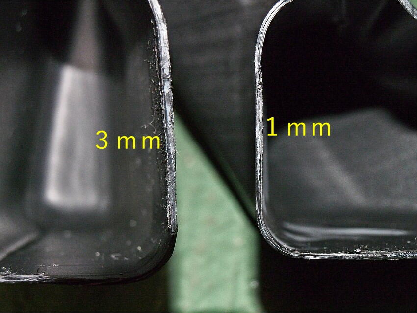 切断時、手前の四角柱に掛かった時間が短かったのは、1mmの板厚だった為。奥側は、3mmと肉厚だった。