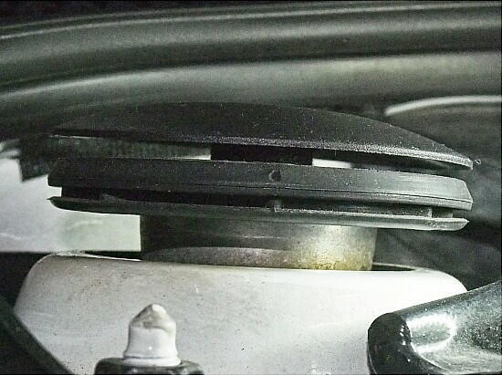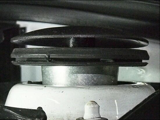 となると、マウンティング ラバー。 サスペンションの交換履歴は無いので、23年物か ..... マウンティング プレートと、アッパーブラケットの隙間を見てみると .... 開いている 左右共に大体、10mm。 本来、隙間は余り無い筈。