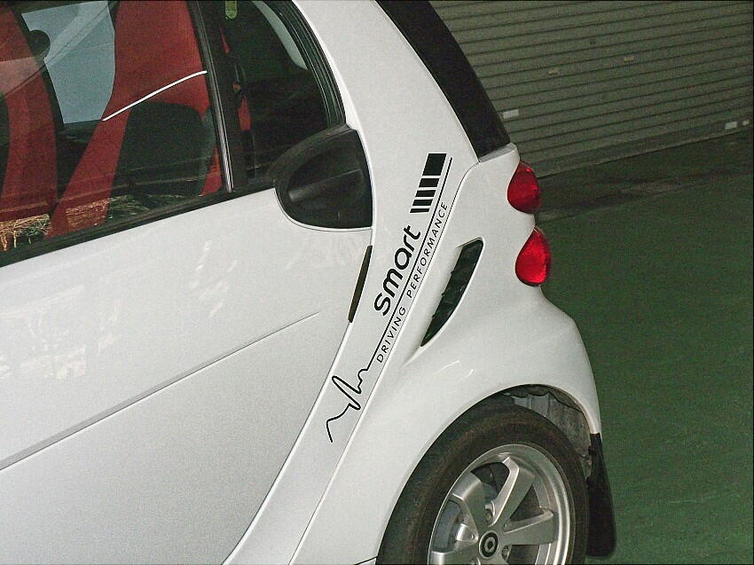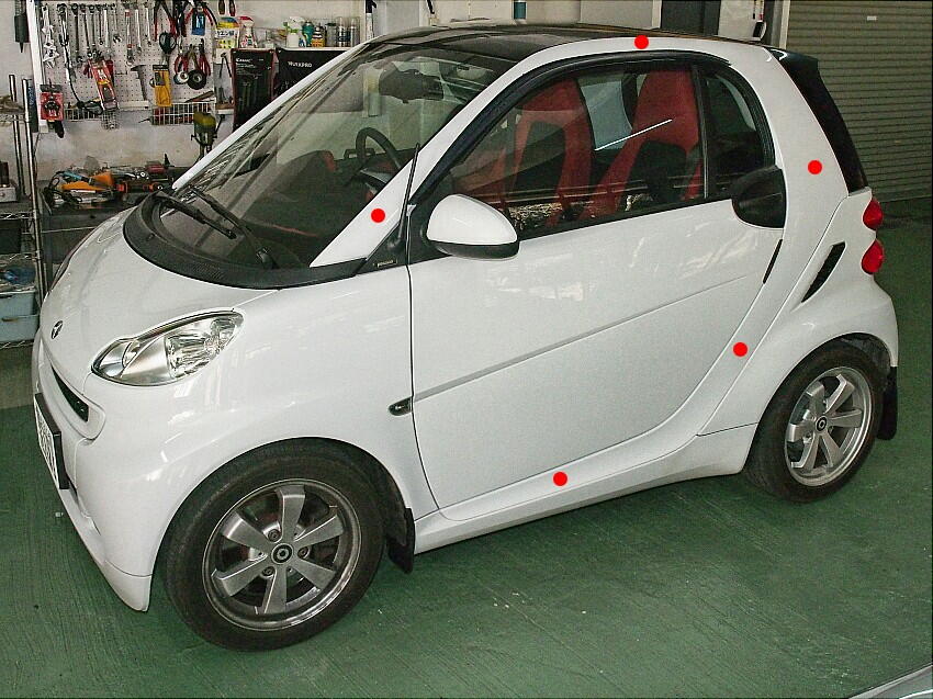 | 我が家のスマートには、サイド〜ルーフに掛けての色が無い。内装は赤なので、赤が有れば引き立つのだが。 外観は、極めてシンプル。 下写真の、赤丸で示した部分の、赤いパネルが、欲しい。 とは言うものの、実現するには、塗装、ラッピングしかないのだが、気が充実していない。